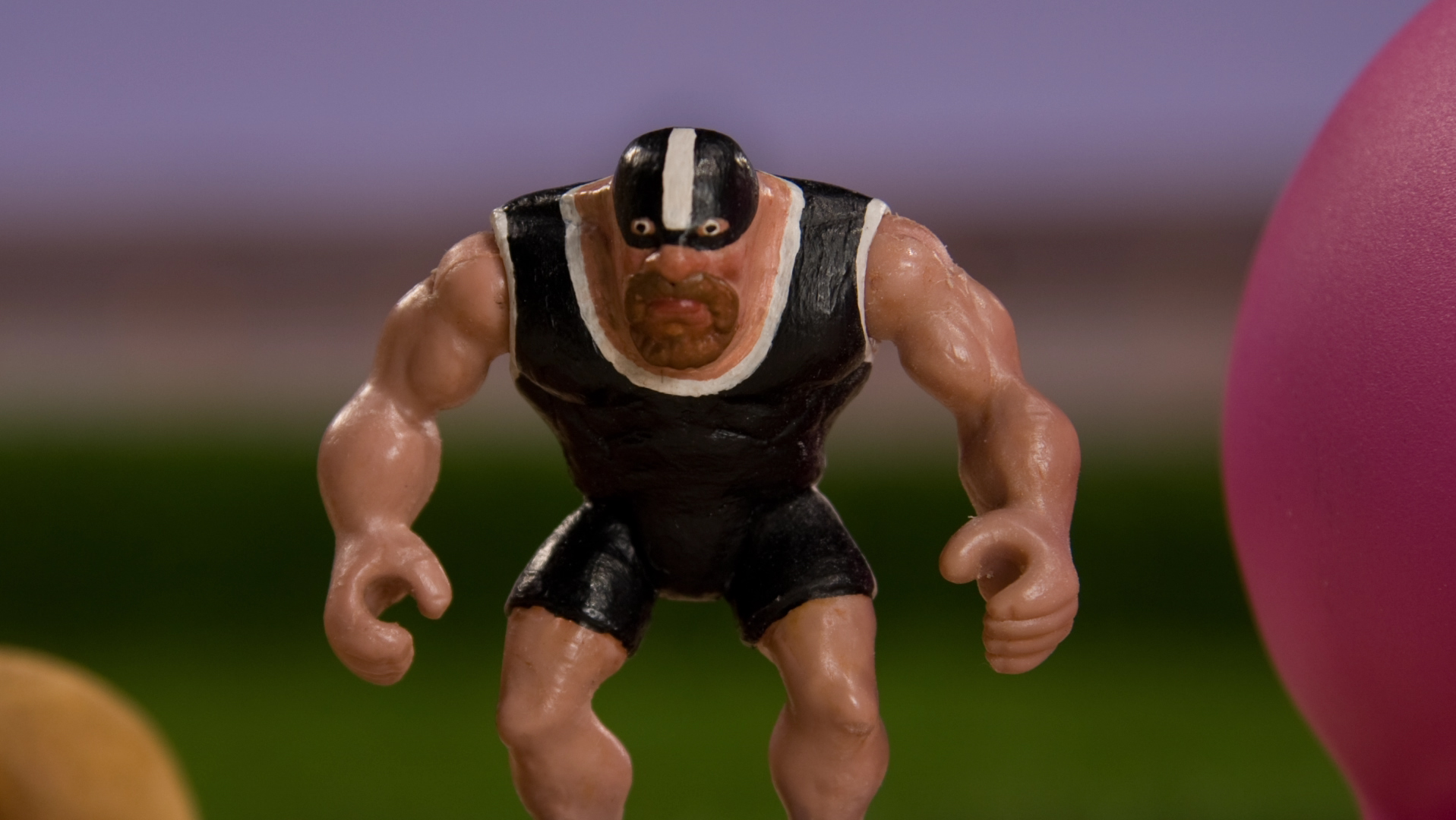 Good evening London ! Dans quelques minutes, vous allez pouvoir assister à une nouvelle épreuve des JO d'été. Le soleil brille sur Nothing Hill et, comme chaque jour, la compétition devrait se dérouler dans un état de fair-play on ne peut plus British. Mais baissez la tête, car nos JO se déroulent au ras du gazon, à l'échelle 1/50e. Le public est familial et les athlètes sont des jouets. Dans ces JO miniatures, pas de règles compliquées car l'important c'est de participer. Tiens, ce catcheur à l'air mauvais aurait-il décidé de tout gâcher ?