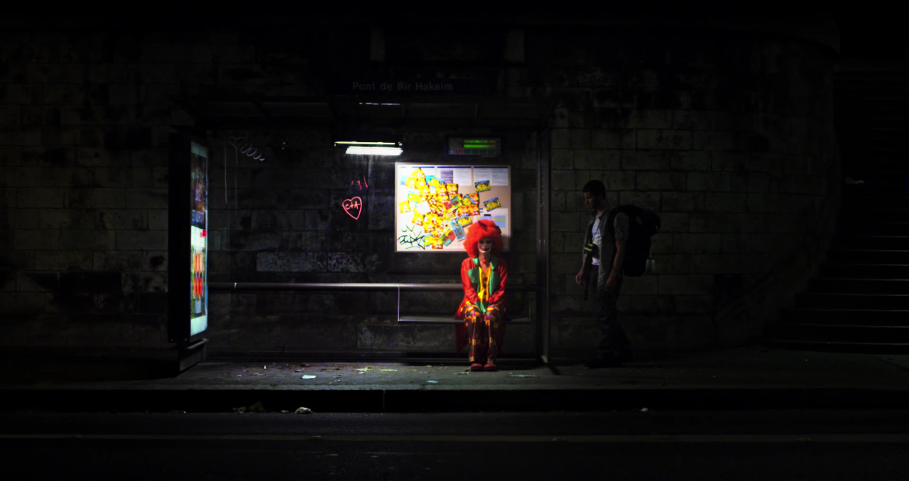 Dans la ville, en pleine nuit, il arrive parfois qu'une fille, déguisée en clown et barbouillée de sang, trouve la rédemption auprès d'un vagabond, alors même qu'elle ne pensait attendre qu'un bus.