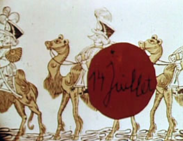 Dessin animé satirique et humoristique racontant l'histoire d'une femme, de son fils et d'un officier un 14 juillet.