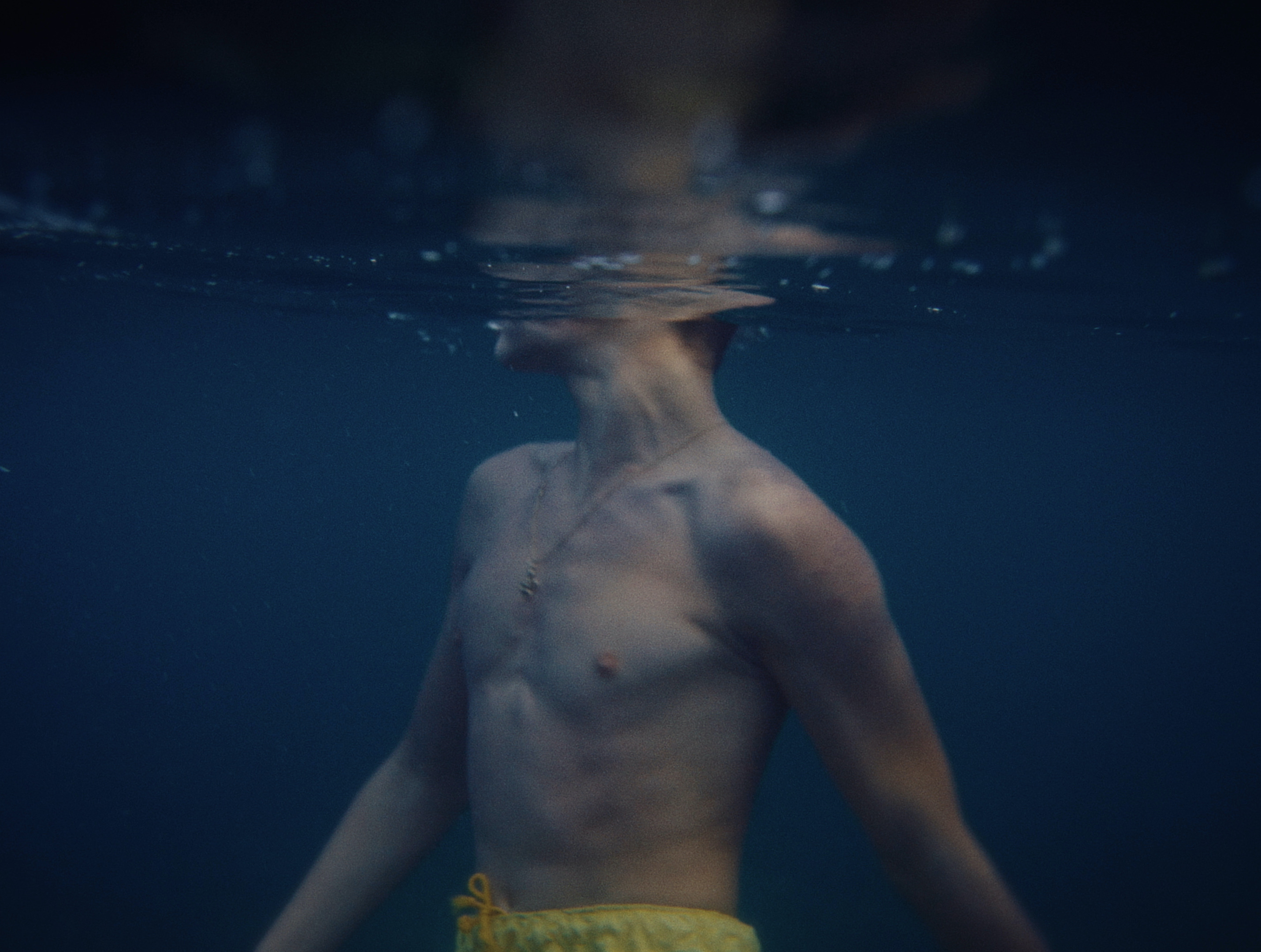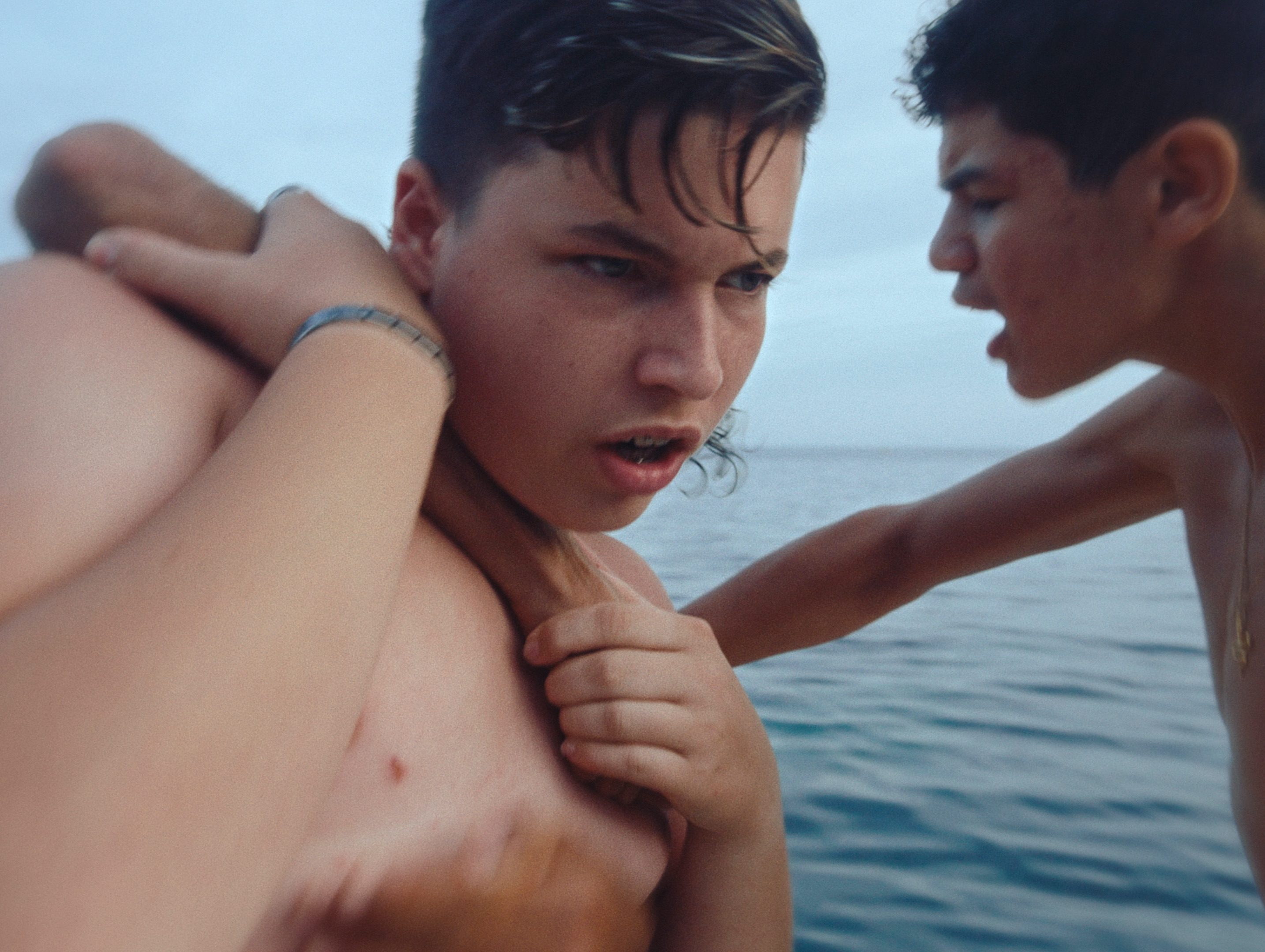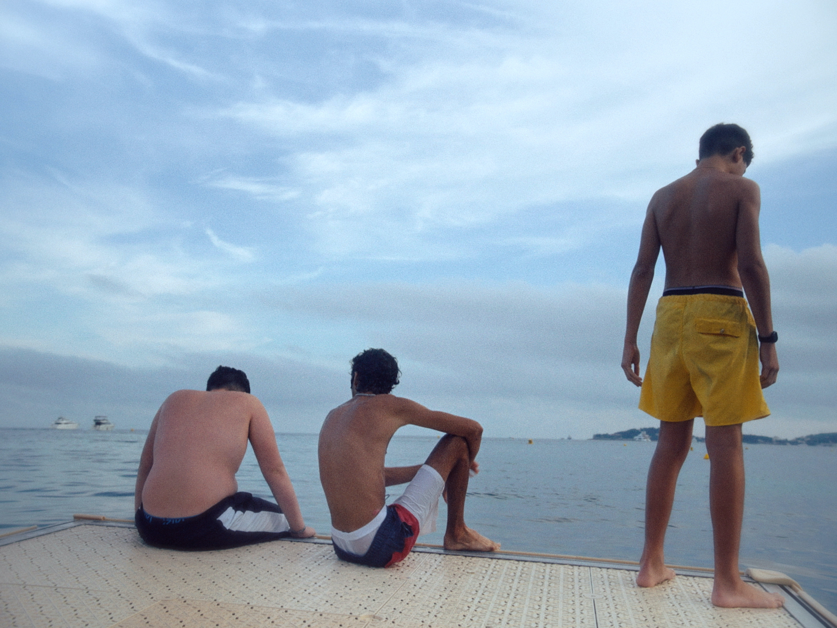 Vacances d’été. Au large d’une plage animée, trois adolescents chahutent et se chambrent sur une plateforme flottante. Lorsqu’ils découvrent qu’un banc de méduses les encercle, leur virilité de façade laisse vite place à une inquiétude enfantine bien difficile à dissimuler.
